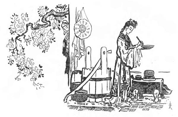— Ой! — здивувався він. На його очах підповз молюсок до краю кадуба, виліз із своєї черепашки, струсив з себе воду і перетворився на гарну дівчину з двома довгими косами, яку він бачив першого разу. З радощів юнакові хотілося підстрибнути, але він не ворухнувся і не промовив ні слова, а, затамувавши подих, спостерігав, як дівчина підійшла до печі, набрала рису, промила його водою, поклала в казан і розпалила вогонь. Прочинив юнак тихенько двері, зайшов до кухні і, відшукавши черепашку, з якої вилізла дівчина, сховав її до кишені. Дівчина тільки тепер почула, що хтось зайшов до кімнати, миттю кинулась до кадуба, та вже було пізно: черепашки не було на місці. Почала вона благати юнака, щоб той віддав її черепашку, але він не схотів.
